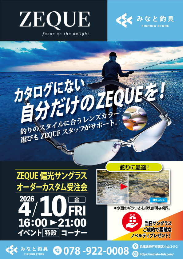 カタログには載っていない、自分だけの1本を。 人気偏光サングラスブランド「ZEQUE(ゼクー)」のスタッフが来店し、あなたの釣りのスタイルに最適なレンズ選びを直接サポートいたします!みなとの日なのでさらにお買い得!