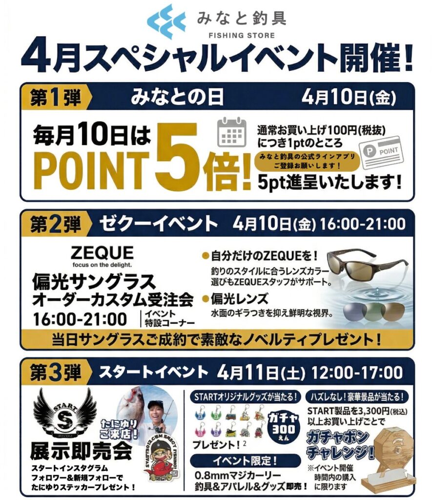 春の釣りシーズン到来!みなと釣具では4月に3つのスペシャルイベントを開催します。ぜひご来店ください!