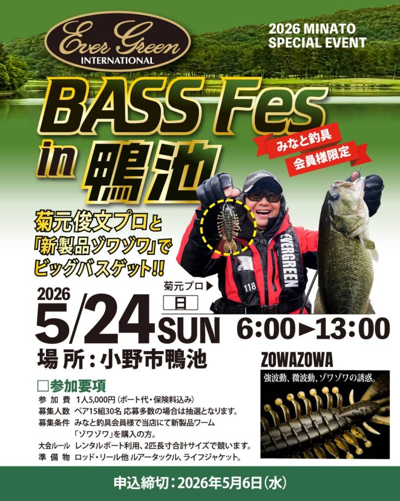 【5/24(日)開催】菊元俊文プロと行く!エバーグリーン 2026BASSfes in 鴨池・小野市
