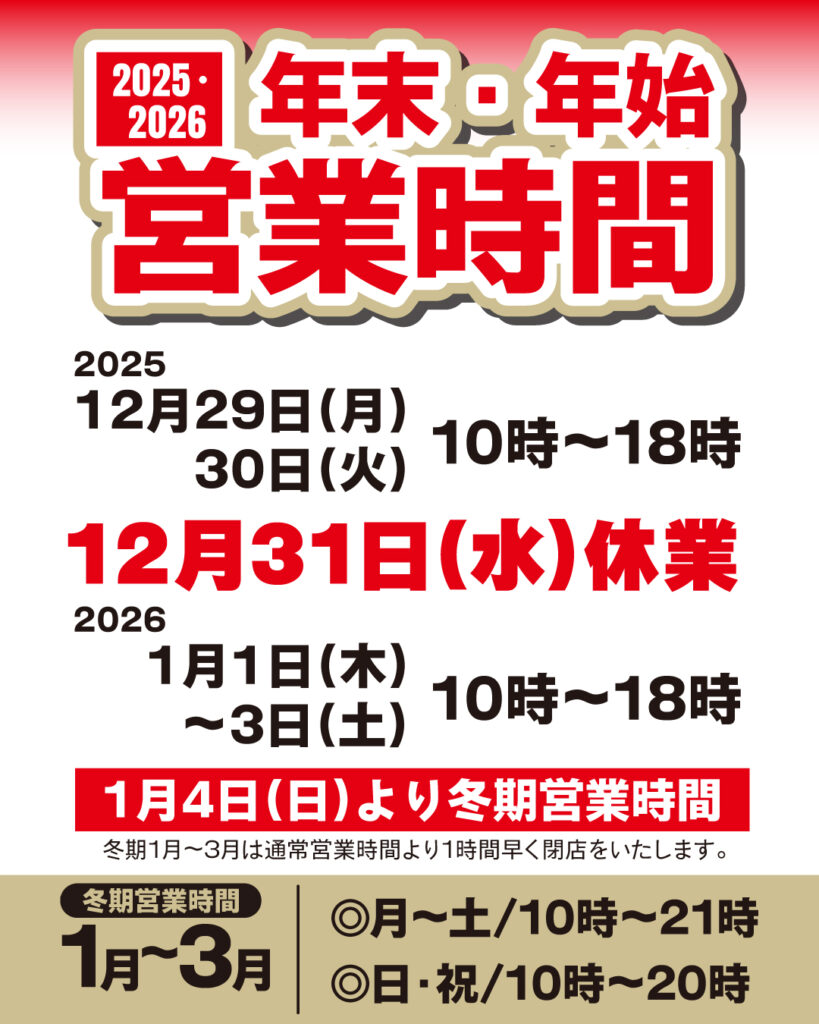 2026年1月4日(日)より冬期営業時間に変更となります。