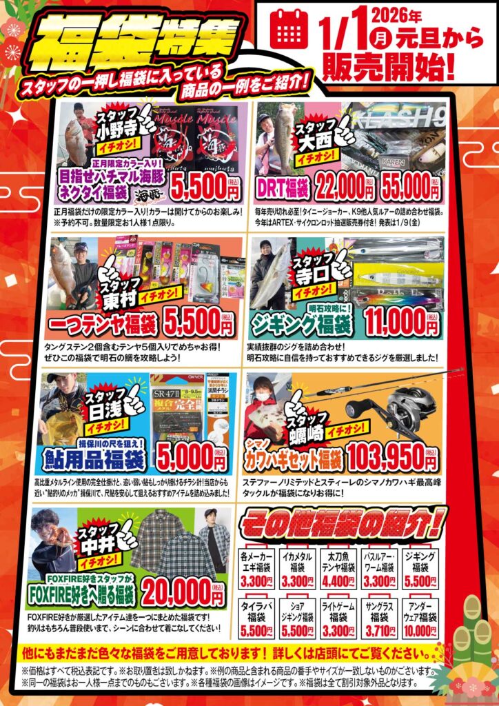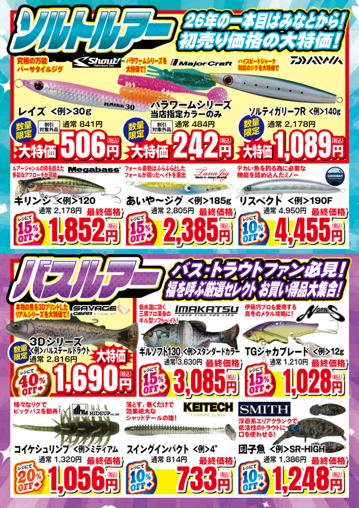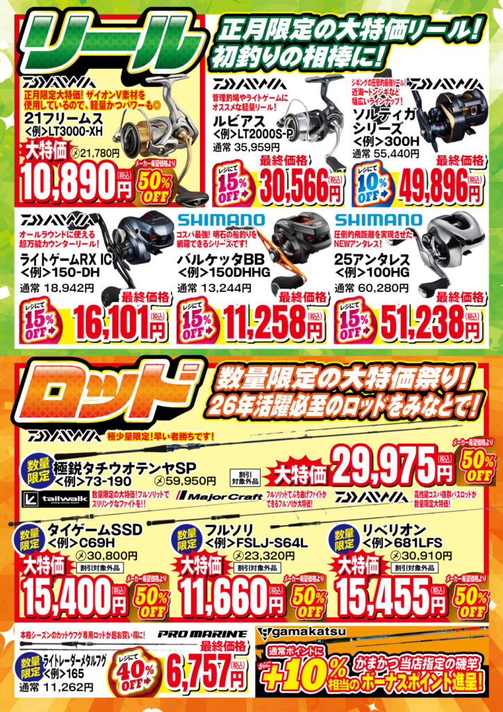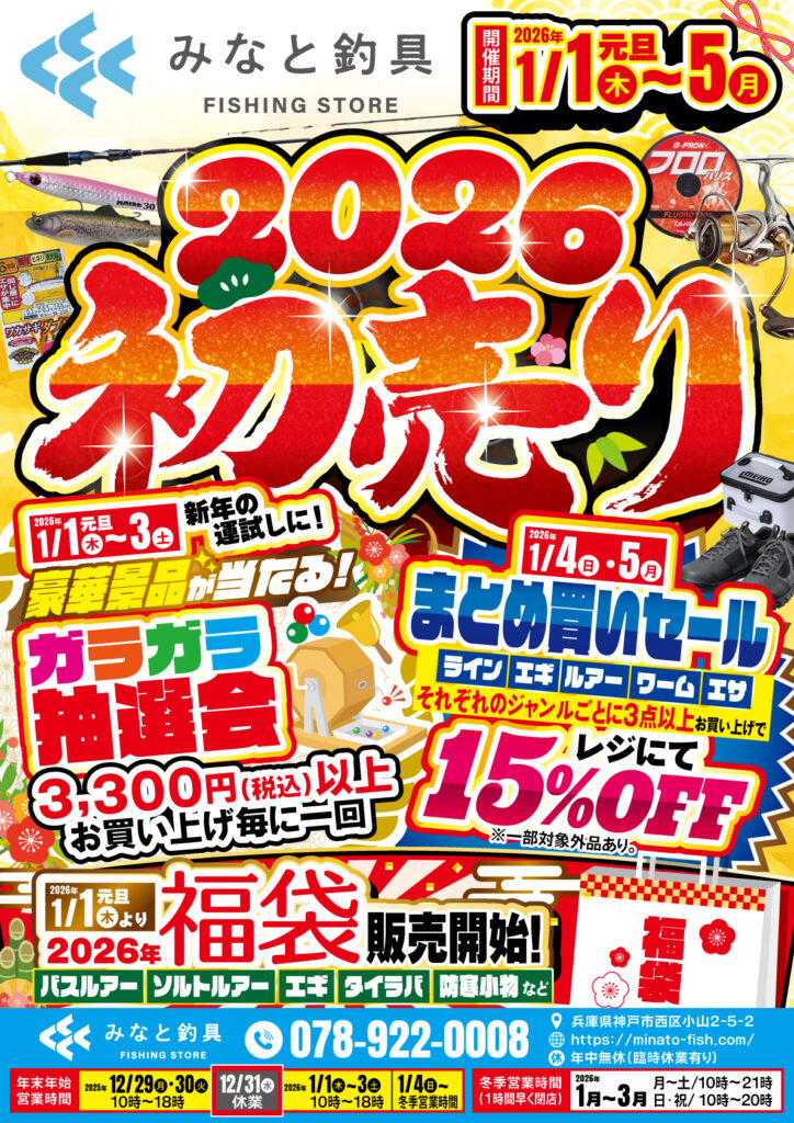 みなと釣具より、新年のビッグイベント「2026年初売り」のお知らせです。 新年を祝う豪華福袋をはじめ、話題のルアー、リール、ロッドを初売りならではの特別価格で多数ご用意いたしました。