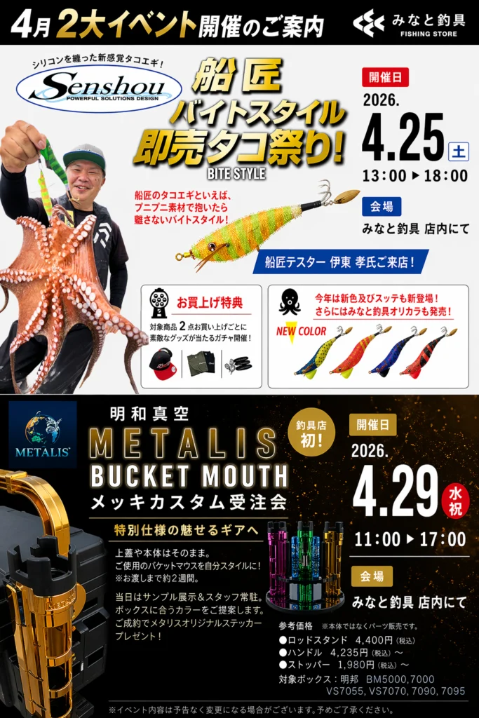 いつも「みなと釣具」をご利用いただき誠にありがとうございます。 4月の店内2大イベント開催についてお知らせいたします。